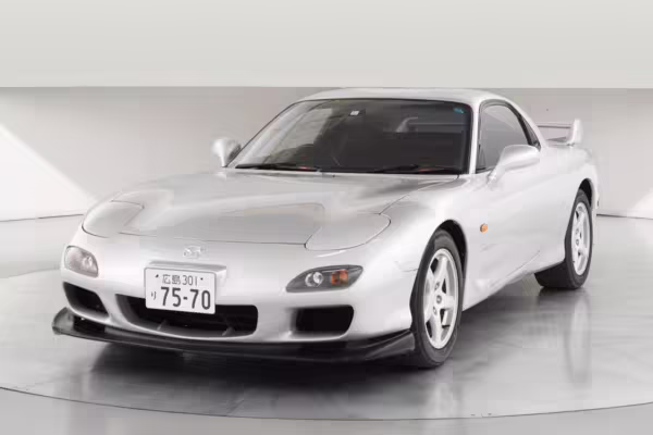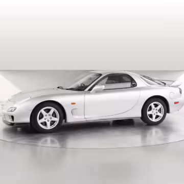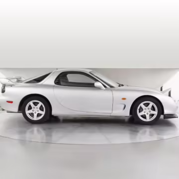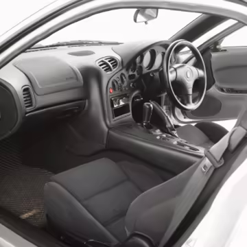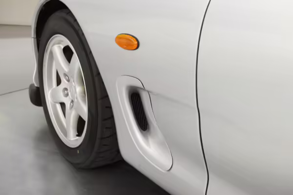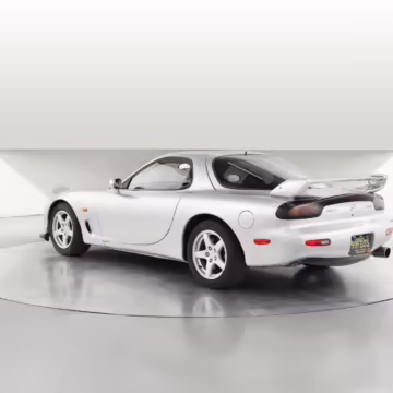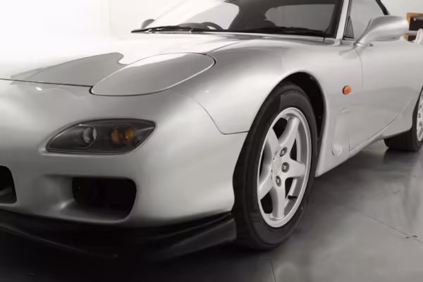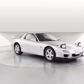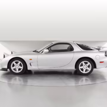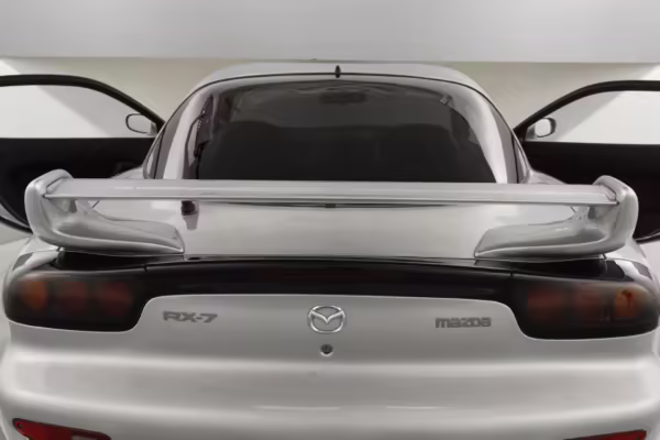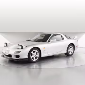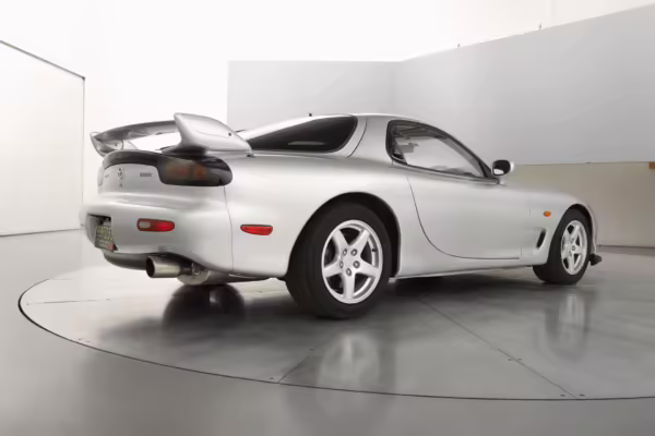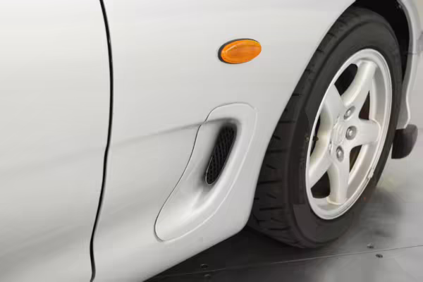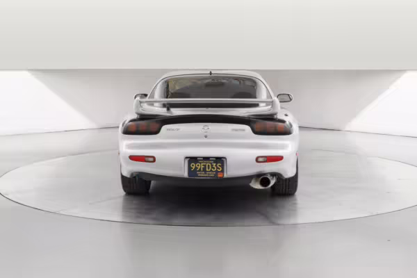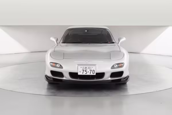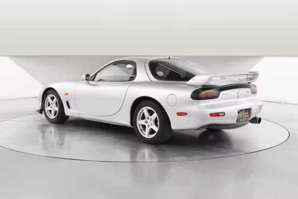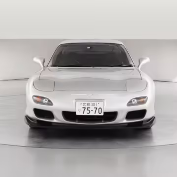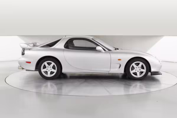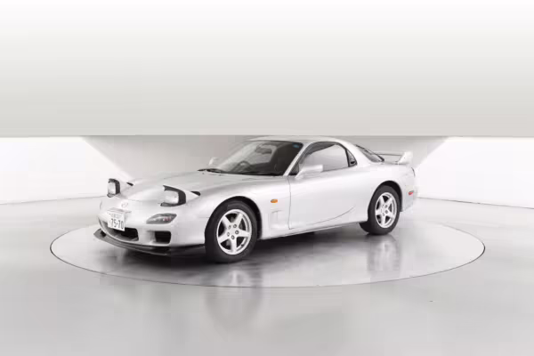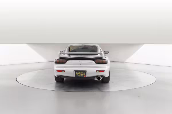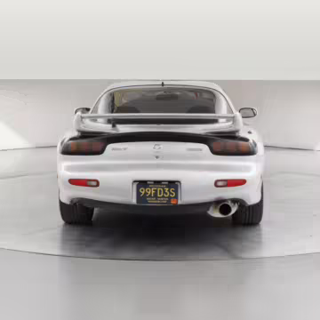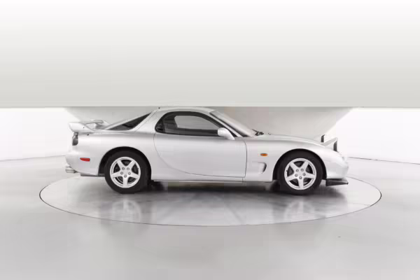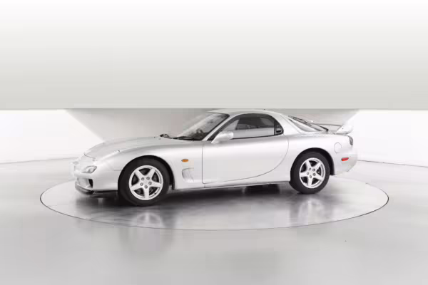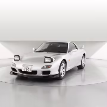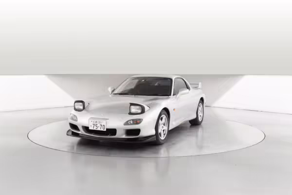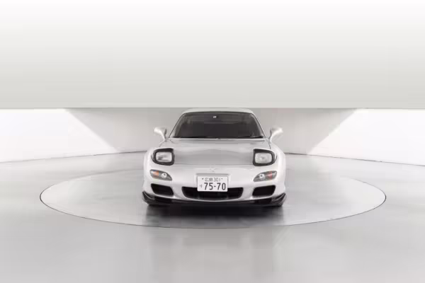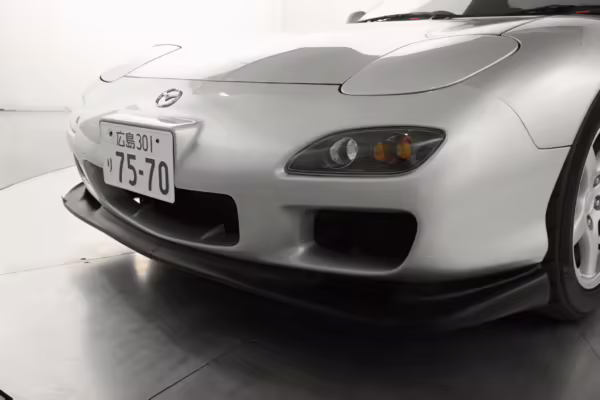 • Launched in Japan by the short-lived ɛ̃fini brand in 1991, Mazda’s third-generation RX-7 (called “FD” internally) was praised by enthusiasts and journalists as a significant improvement over its predecessor. Its more fluid lines aligned it with the design trends of the 1990s, and the Wankel rotary gave it Porsche-like performance without the price tag. The FD saw numerous updates throughout its lifespan, and final-version Series 8 models such as this one received updates such as facelifted bumpers, a 4-level adjustable rear spoiler, and increased output from its sequential twin-turbocharged rotary engine.