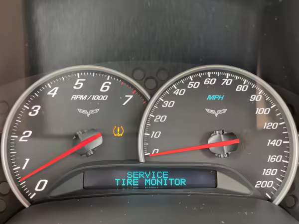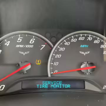 TPMS warning light on dash; the seller states that this is due to the tire pressure sensors on the aftermarket wheels having not been synced to the car.