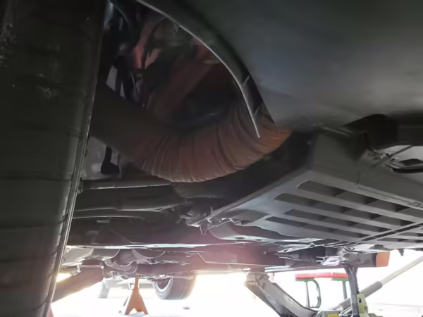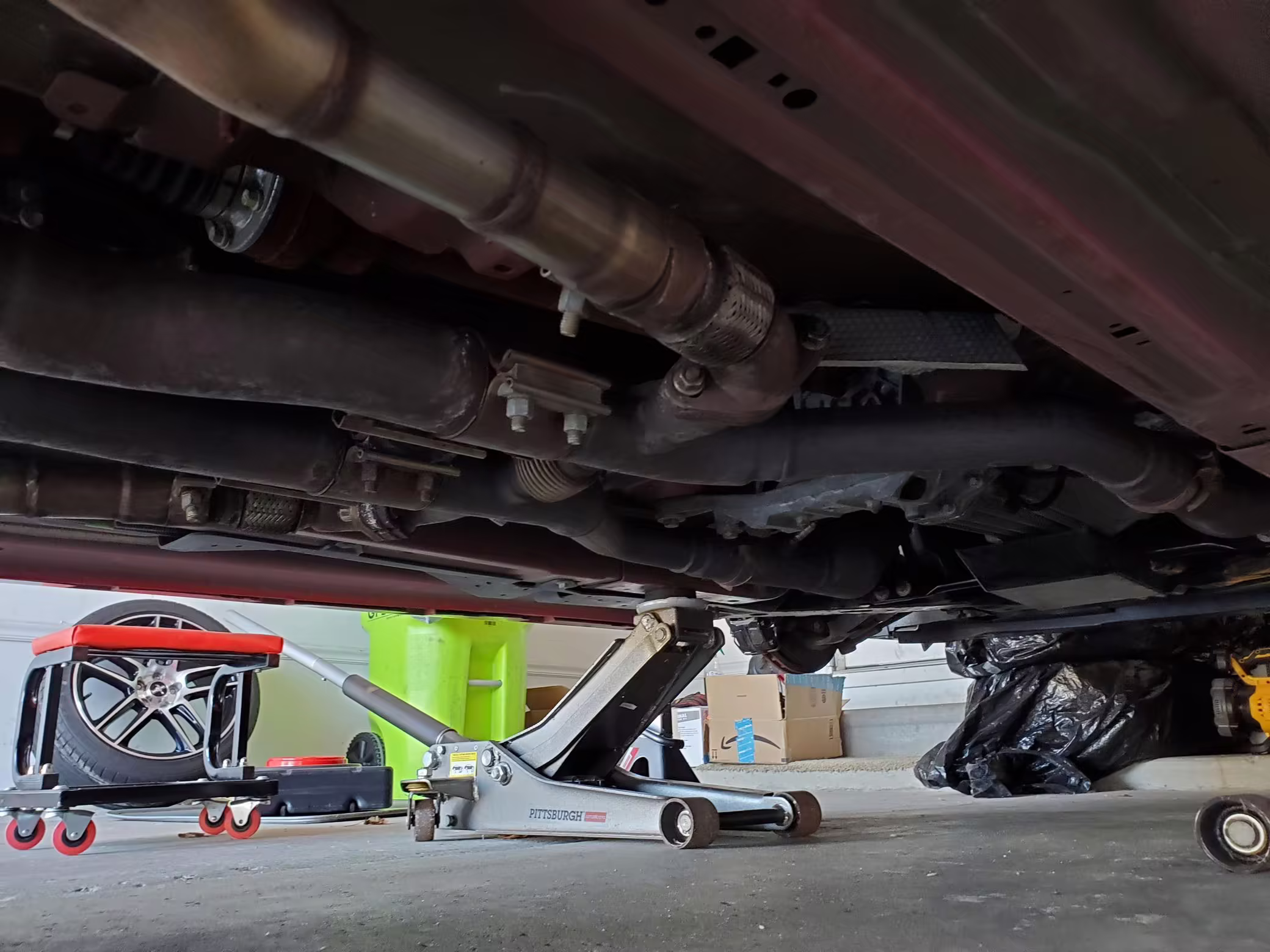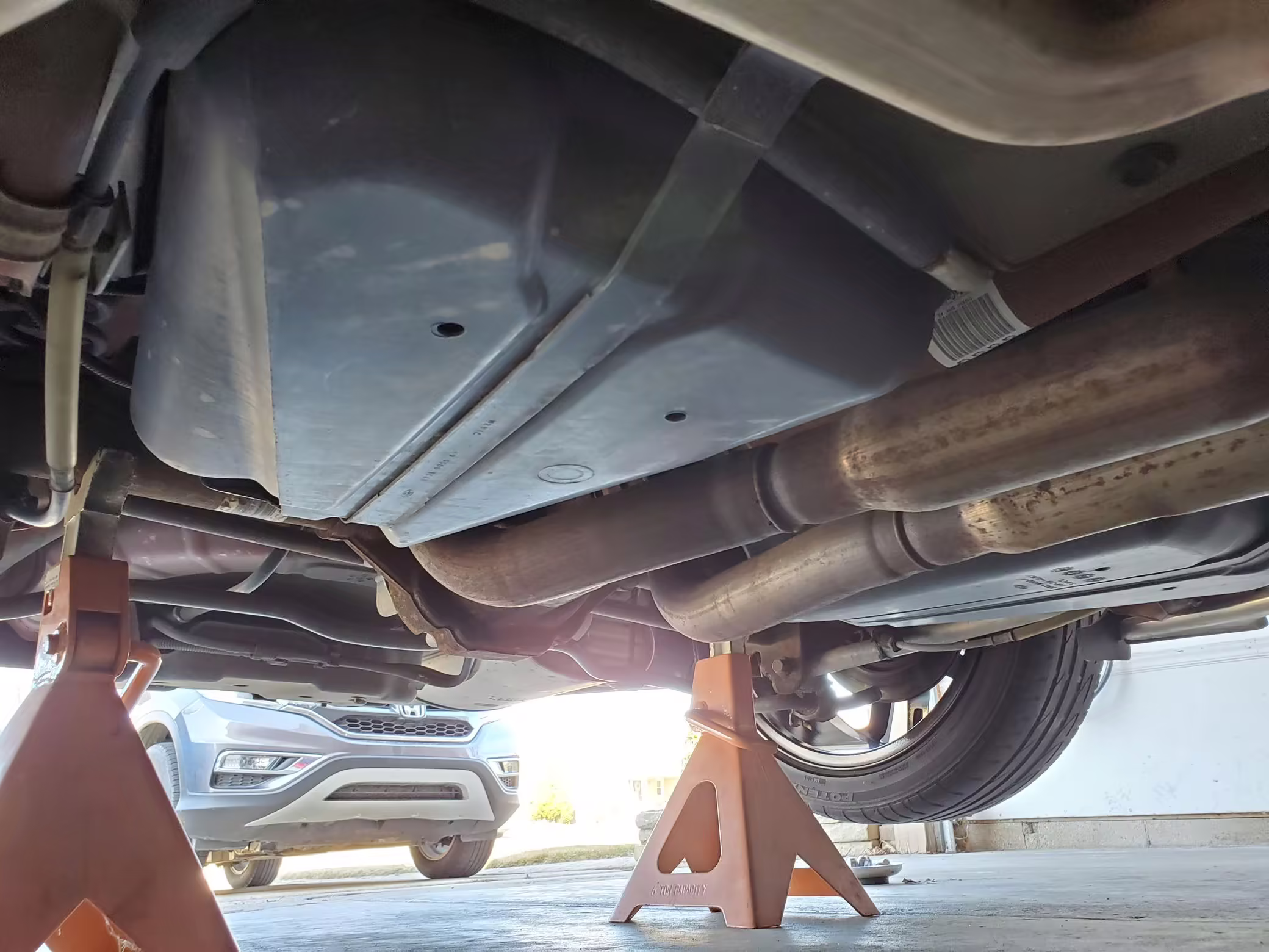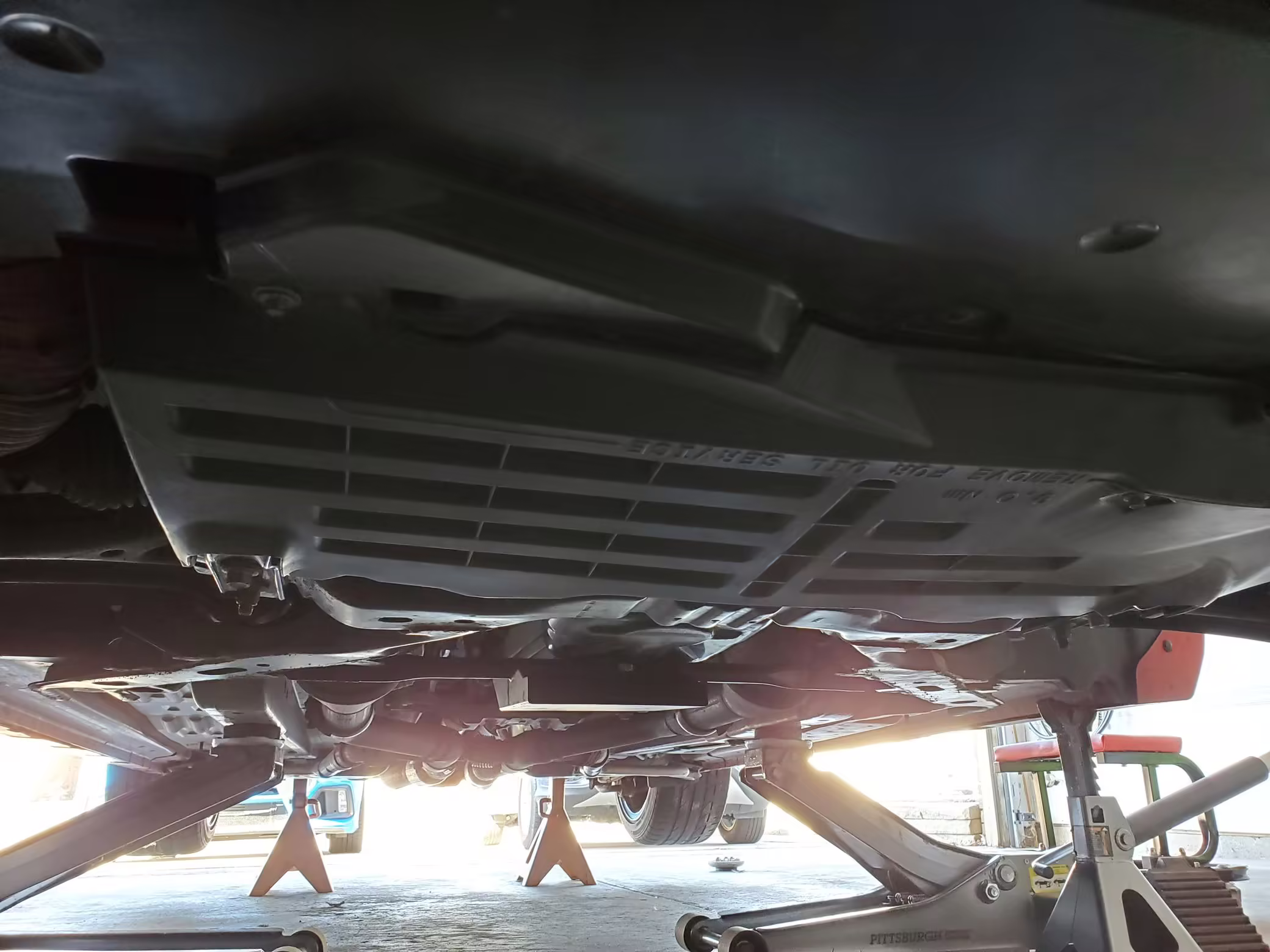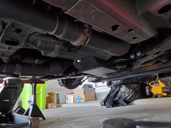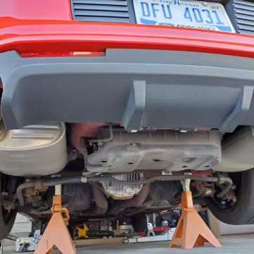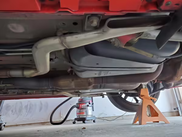 Factory items removed during modifications (shocks, springs, pan hard bar, radiator, pencil brace, axle-back exhaust, differential cover, front brake calipers)
