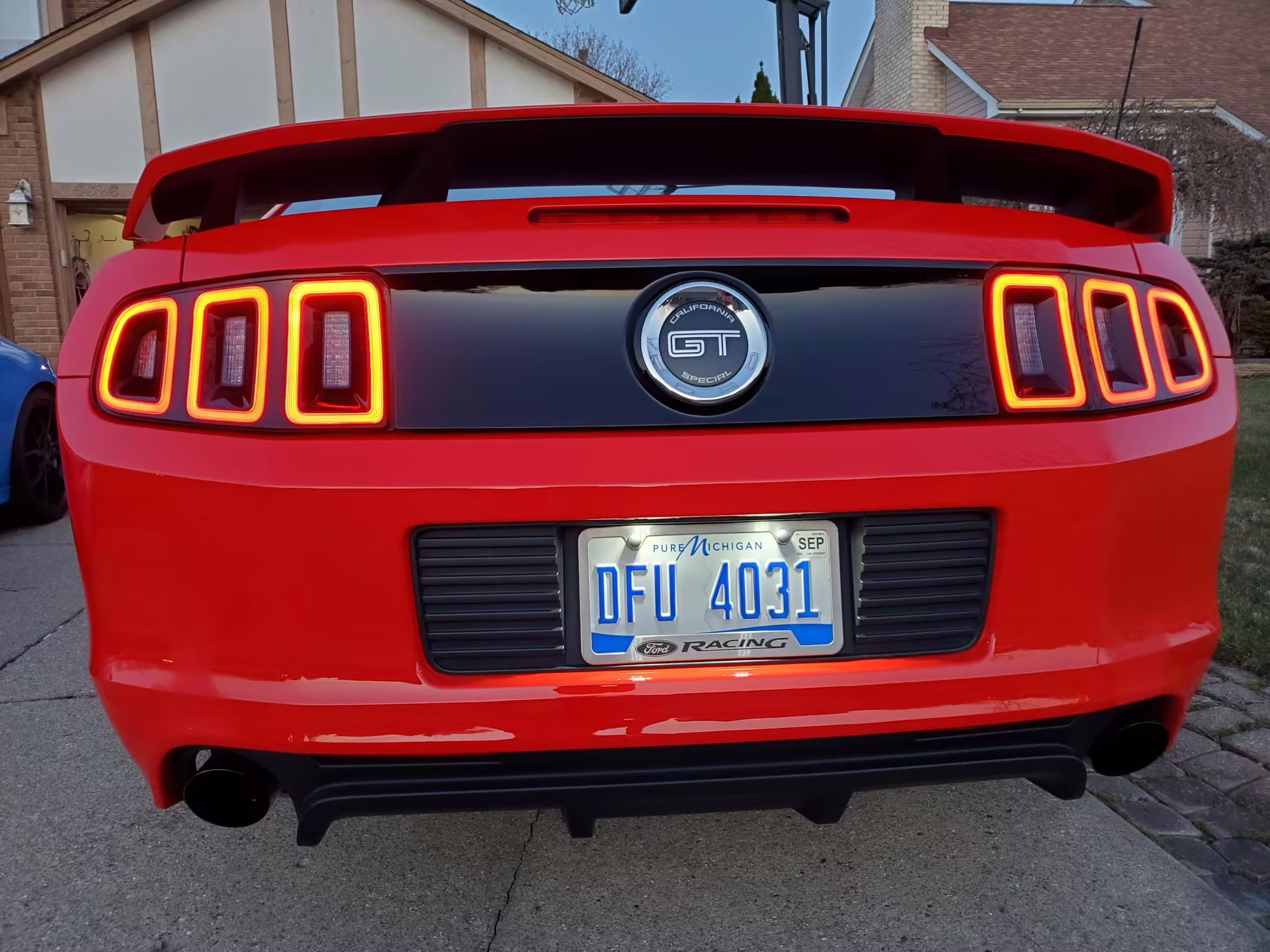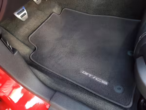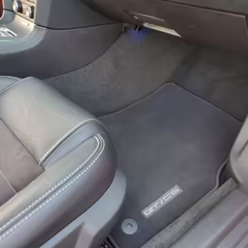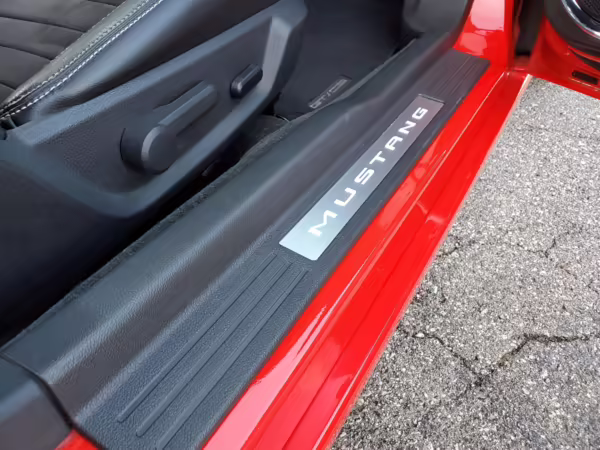 California Special Package (GT/CS black carpet floor mats, GT/CS side stripes, GT/CS hood stripes, gloss black front grilles and hood vents, unique “tri-bar” pony front badge and “California Special” rear badge, side scoops, pedestal rear spoiler)