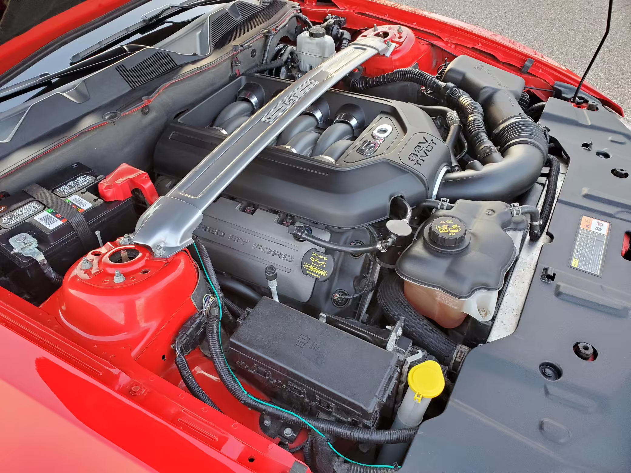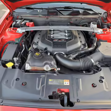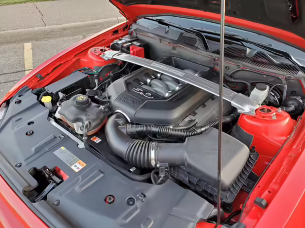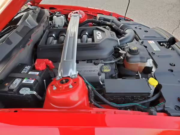 Power comes from a 5.0-liter “Coyote” V8, which produces 420 horsepower and 390 lb-ft of torque in stock form. The Ford Performance tune on this Mustang is rated at roughly 436 horsepower and 400 lb-ft of torque, but no dyno sheet was provided to confirm. The engine spins the rear wheels via a 6-speed manual transmission.