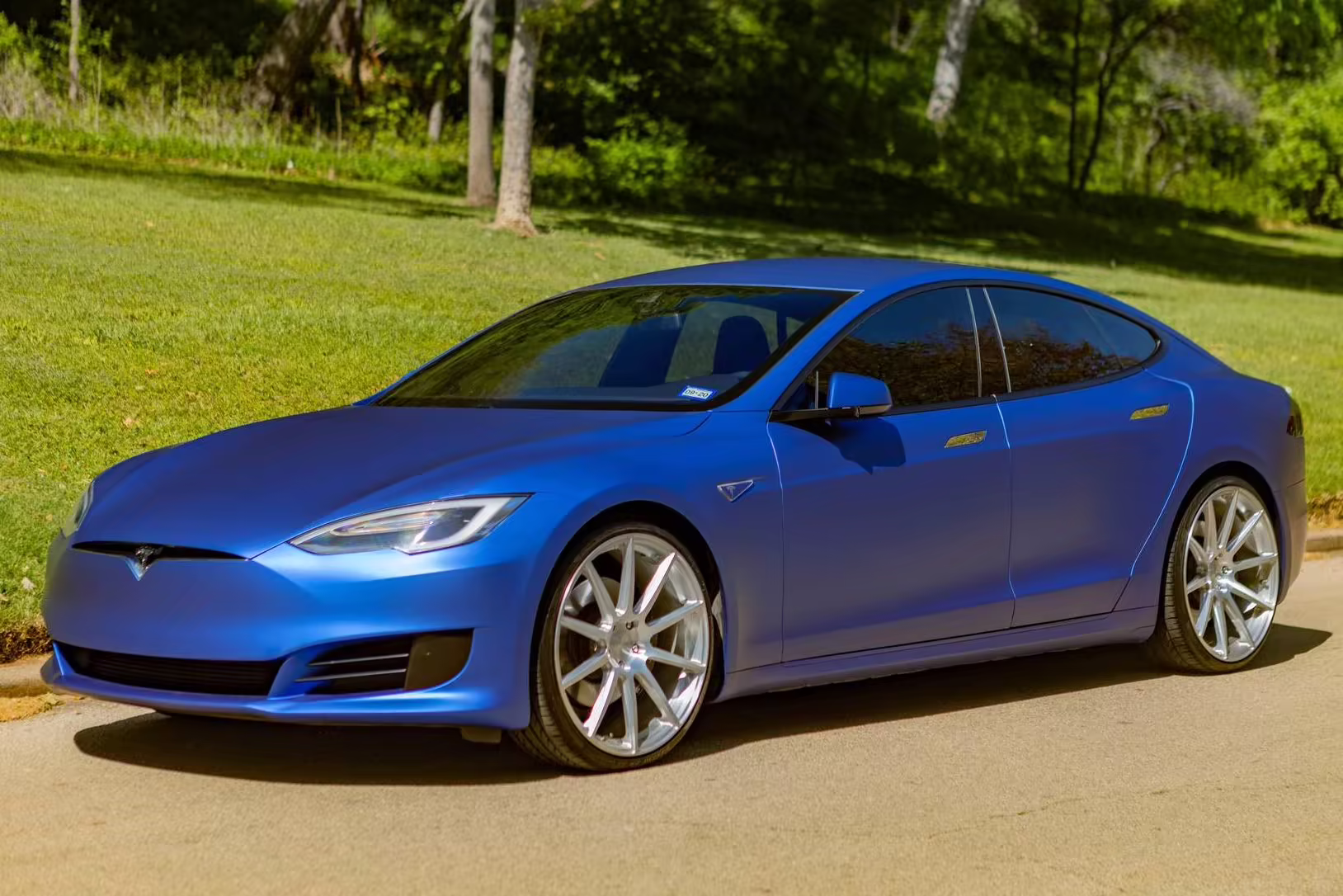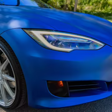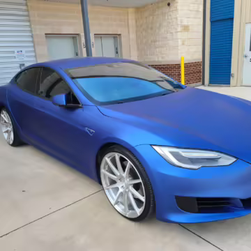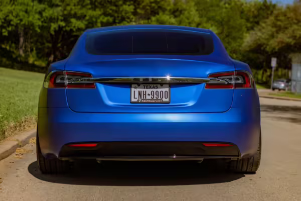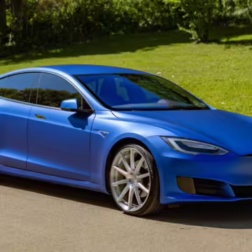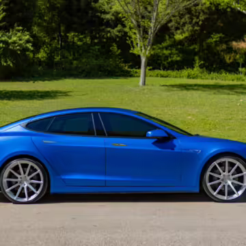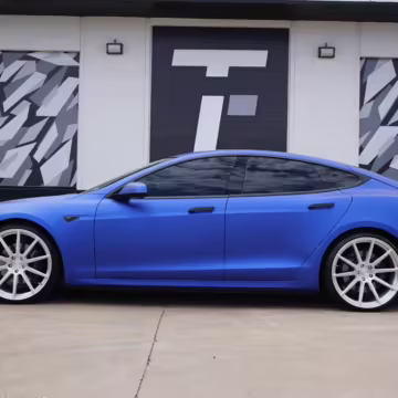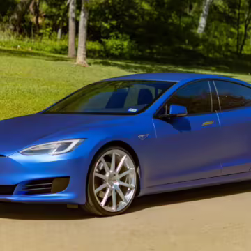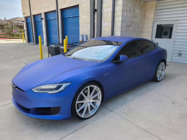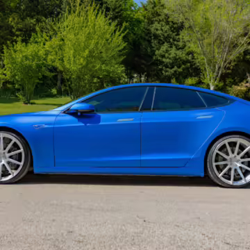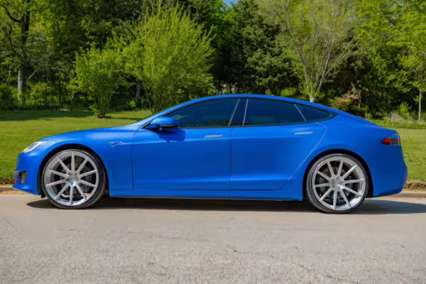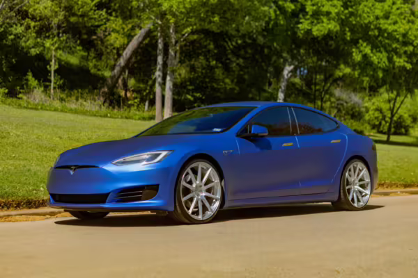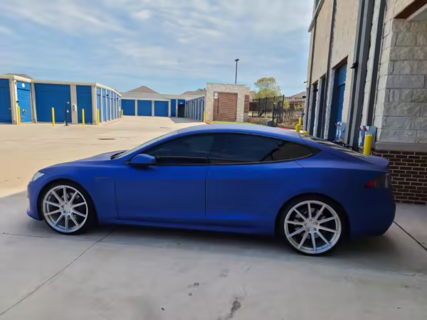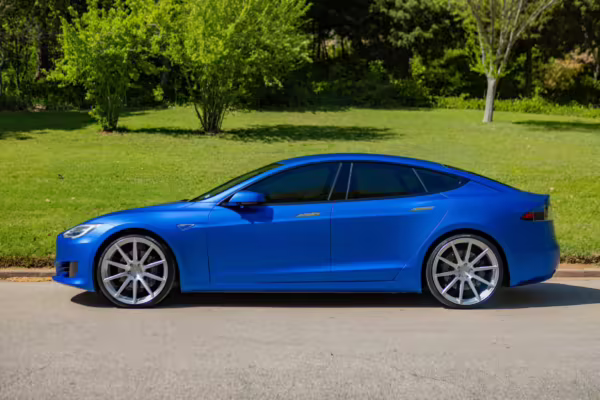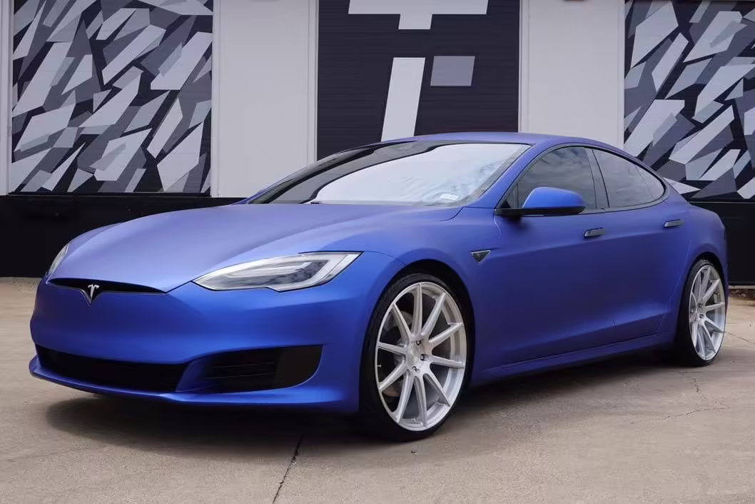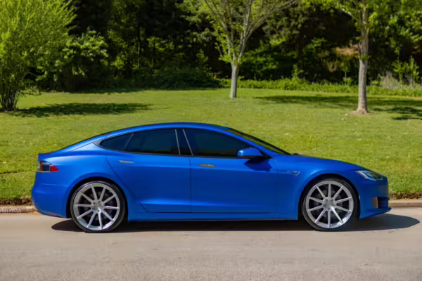 2016 Tesla Model S 75, finished in blue with an Avery Intelligent Blue wrap and a black leather interior.