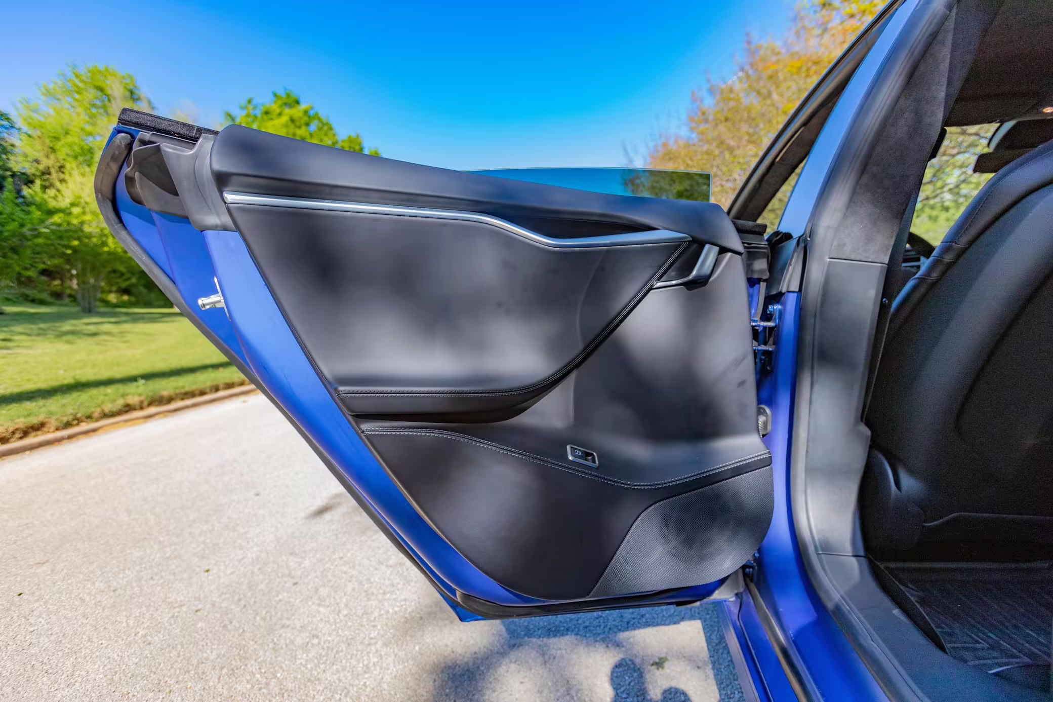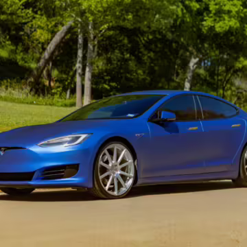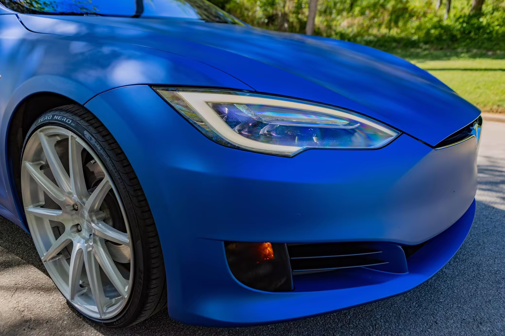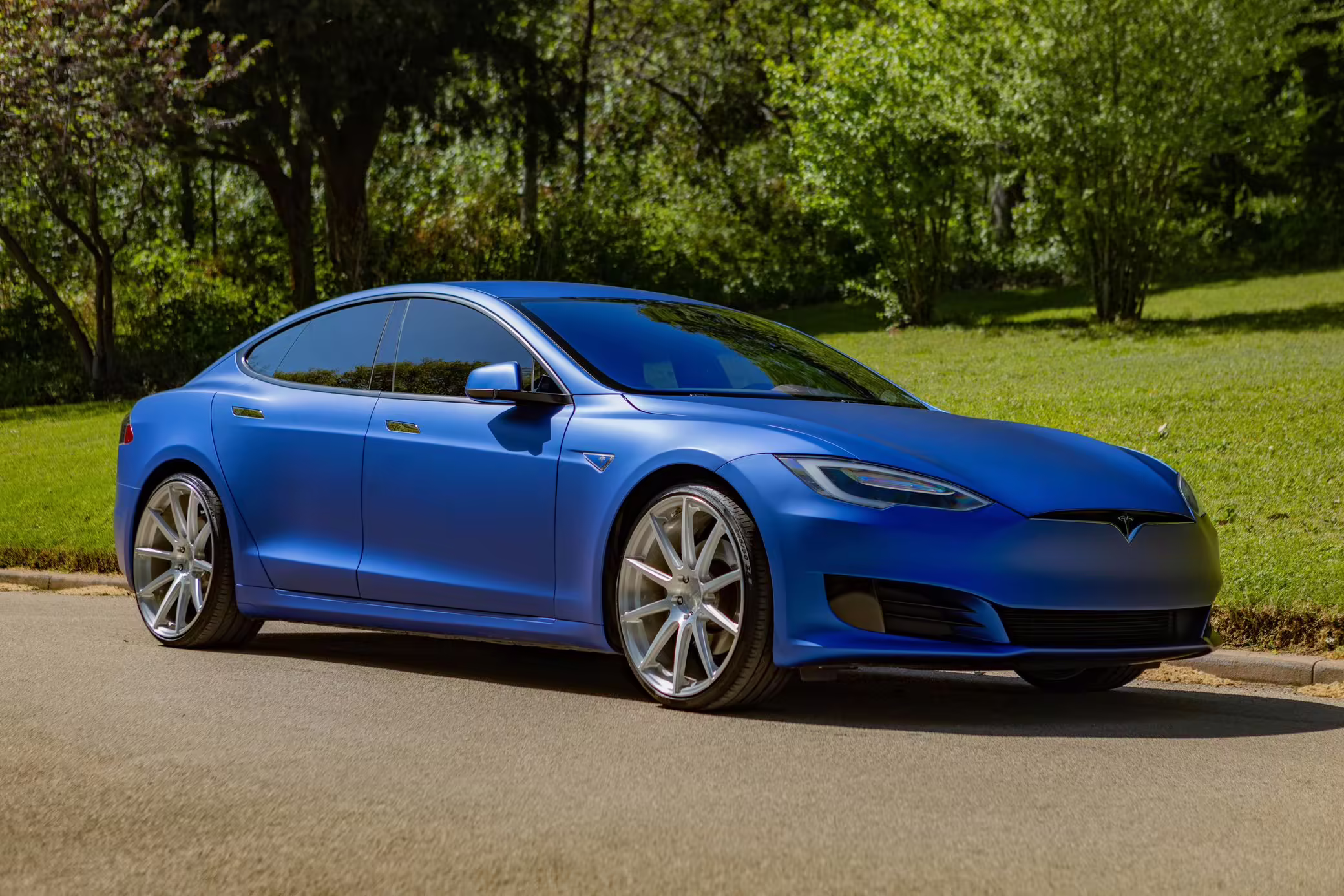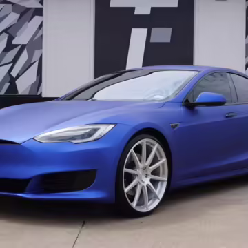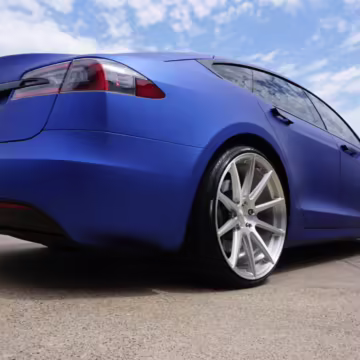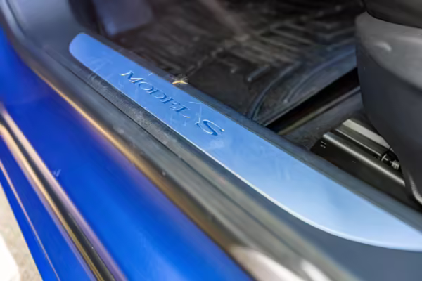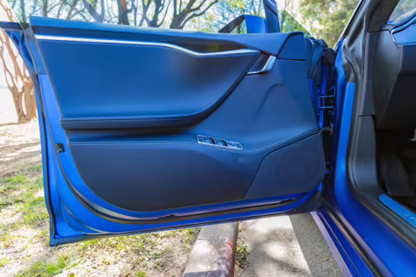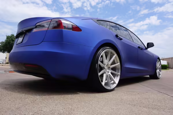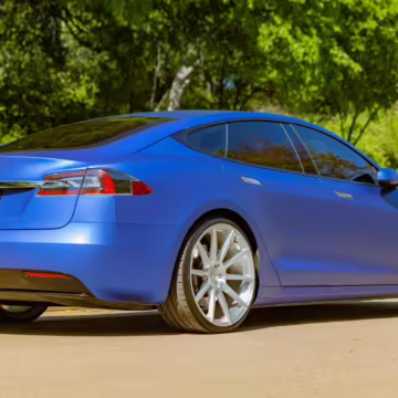 2016 Tesla Model S 75, finished in blue with an Avery Intelligent Blue wrap and a black leather interior.