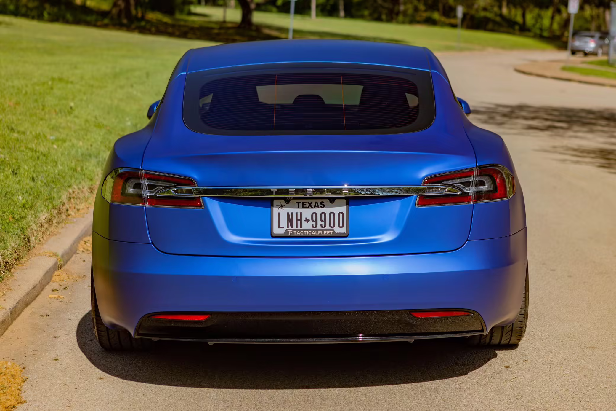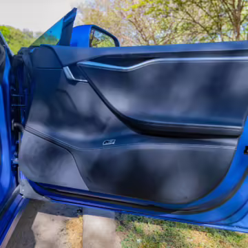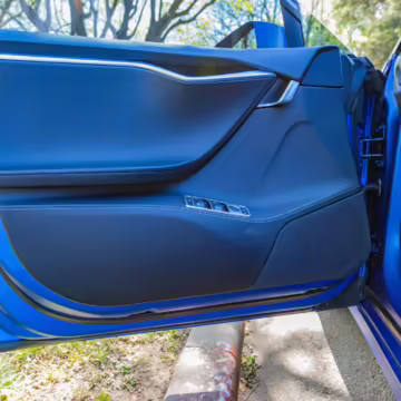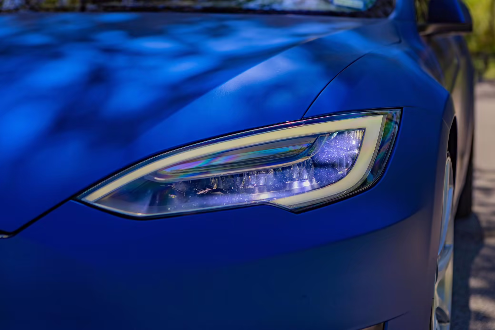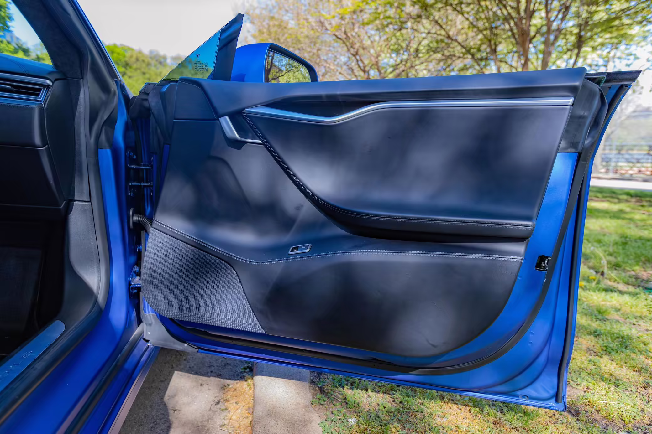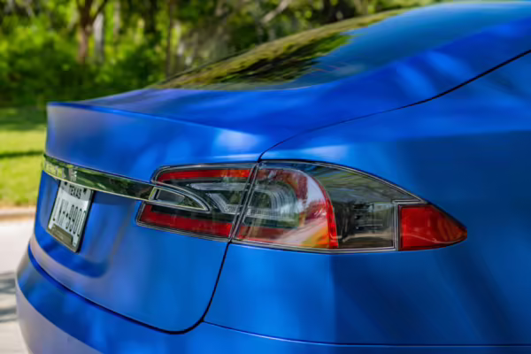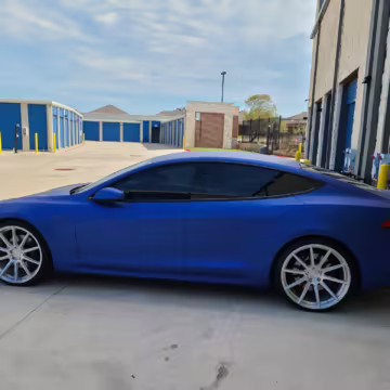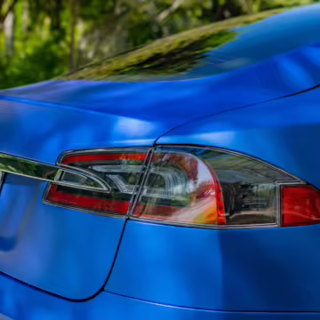 2016 Tesla Model S 75, finished in blue with an Avery Intelligent Blue wrap and a black leather interior.