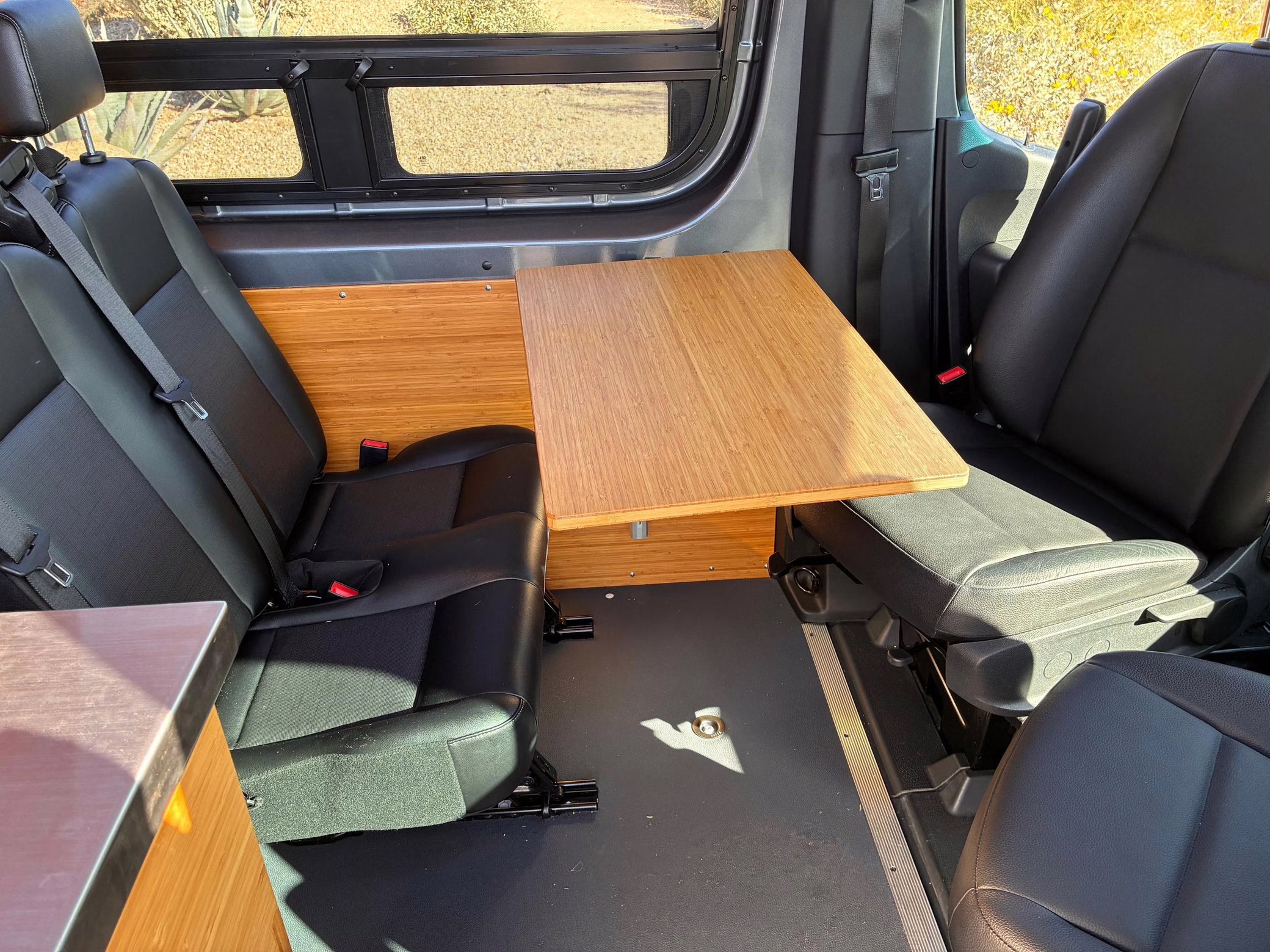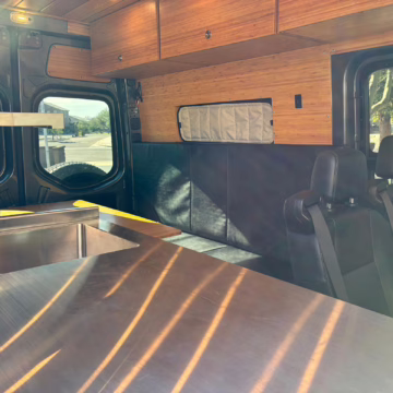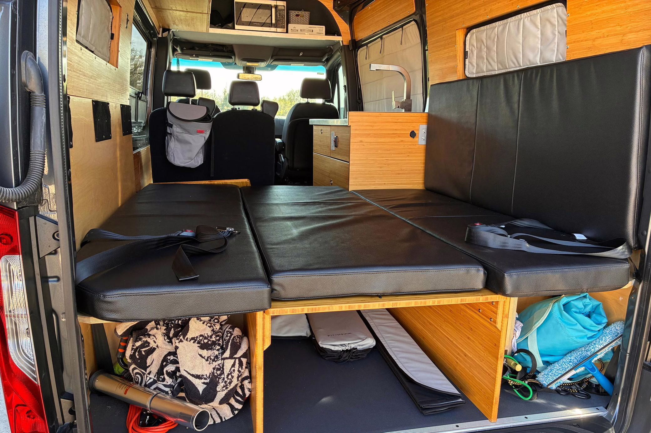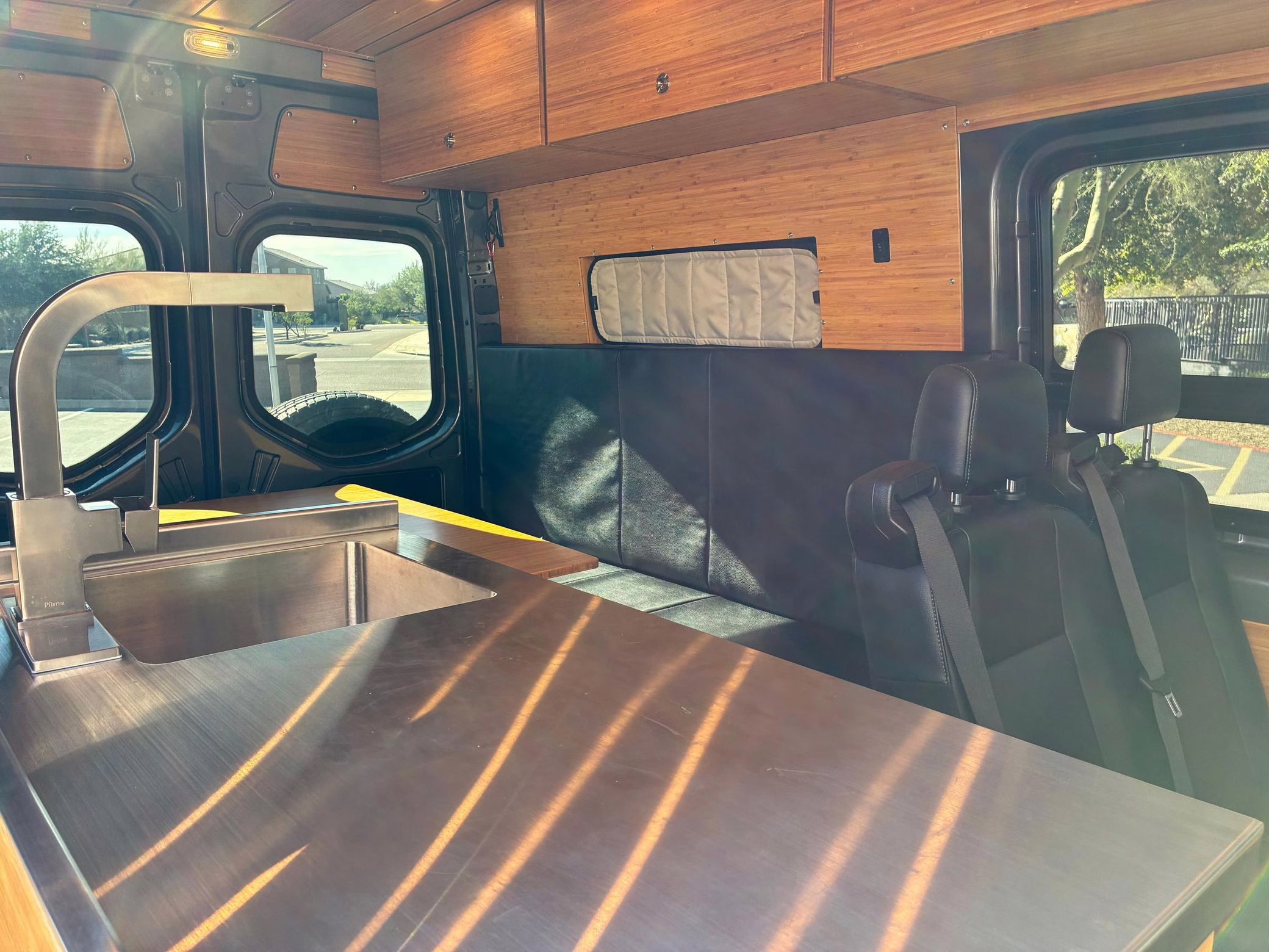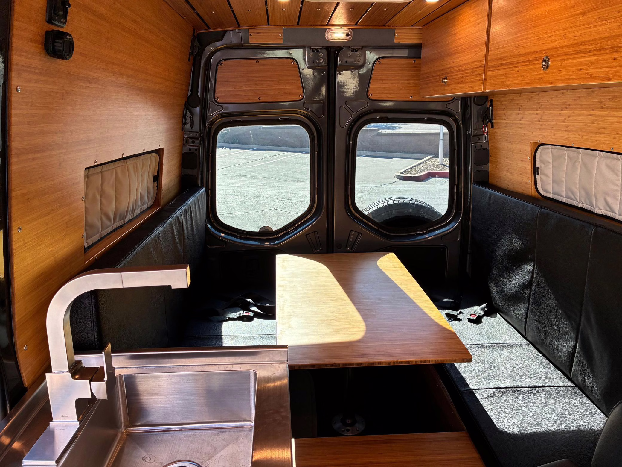• This van has been modified by Apex Van Designs, and a list of notable modifications reported by the seller is detailed below. Highlights include a 300-watt solar panel with mounting bracket, a self-supporting electric awning, CR Lawrence vent windows, a convertible bed with booth-style seating, overhead cabinets, a Maxxfan RV roof vent/fan, bamboo-themed interior materials, a stainless steel sink with faucet, and a refrigerator.
