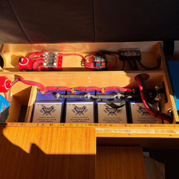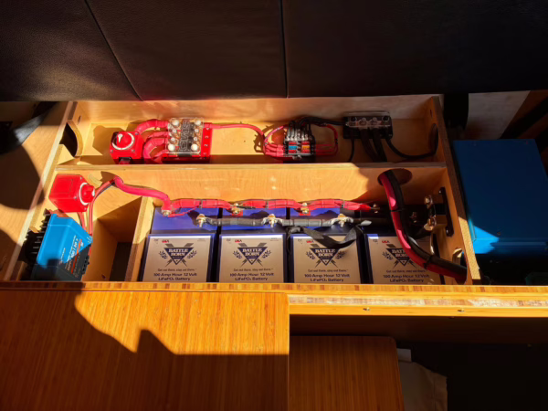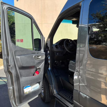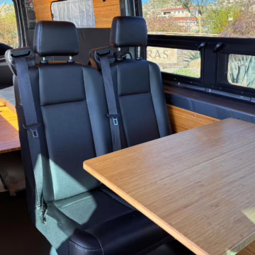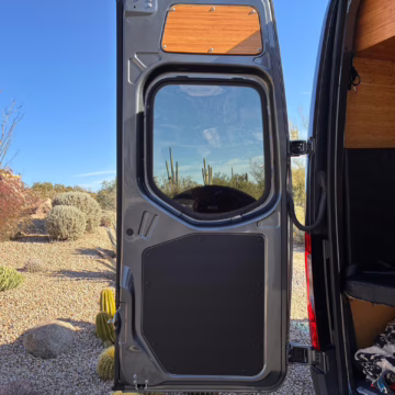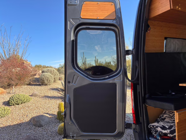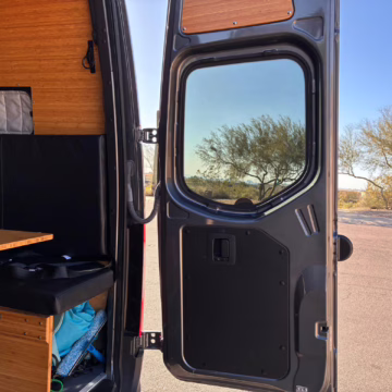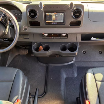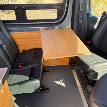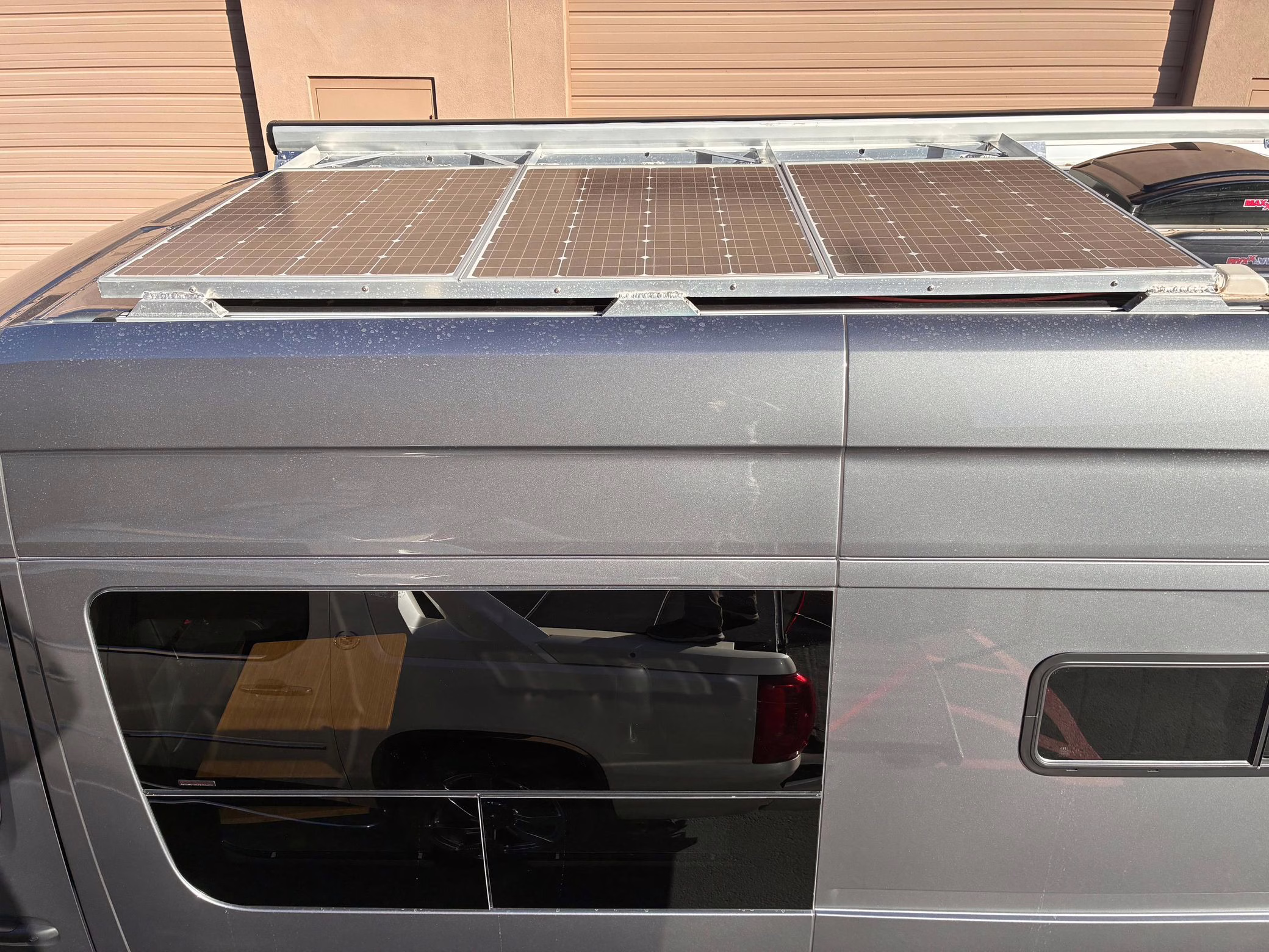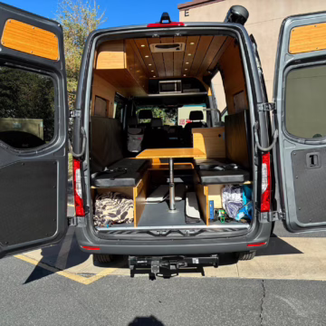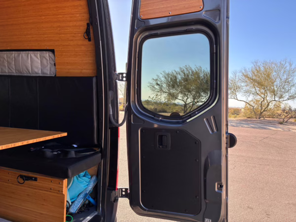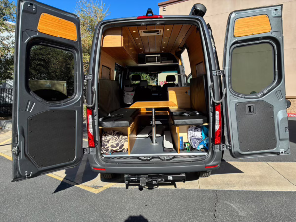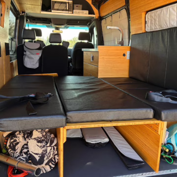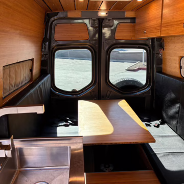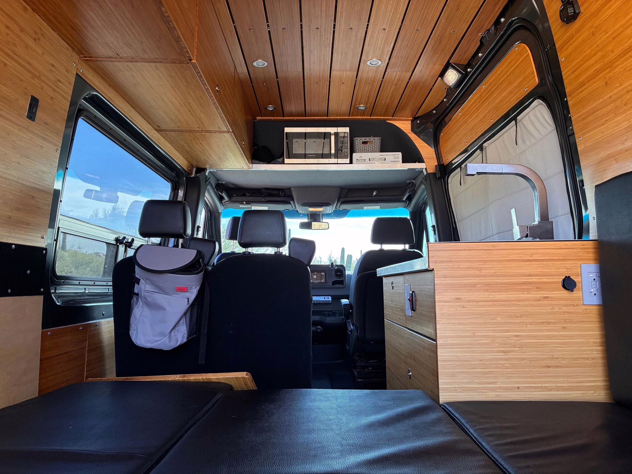 • This van has been modified by Apex Van Designs, and a list of notable modifications reported by the seller is detailed below. Highlights include a 300-watt solar panel with mounting bracket, a self-supporting electric awning, CR Lawrence vent windows, a convertible bed with booth-style seating, overhead cabinets, a Maxxfan RV roof vent/fan, bamboo-themed interior materials, a stainless steel sink with faucet, and a refrigerator.